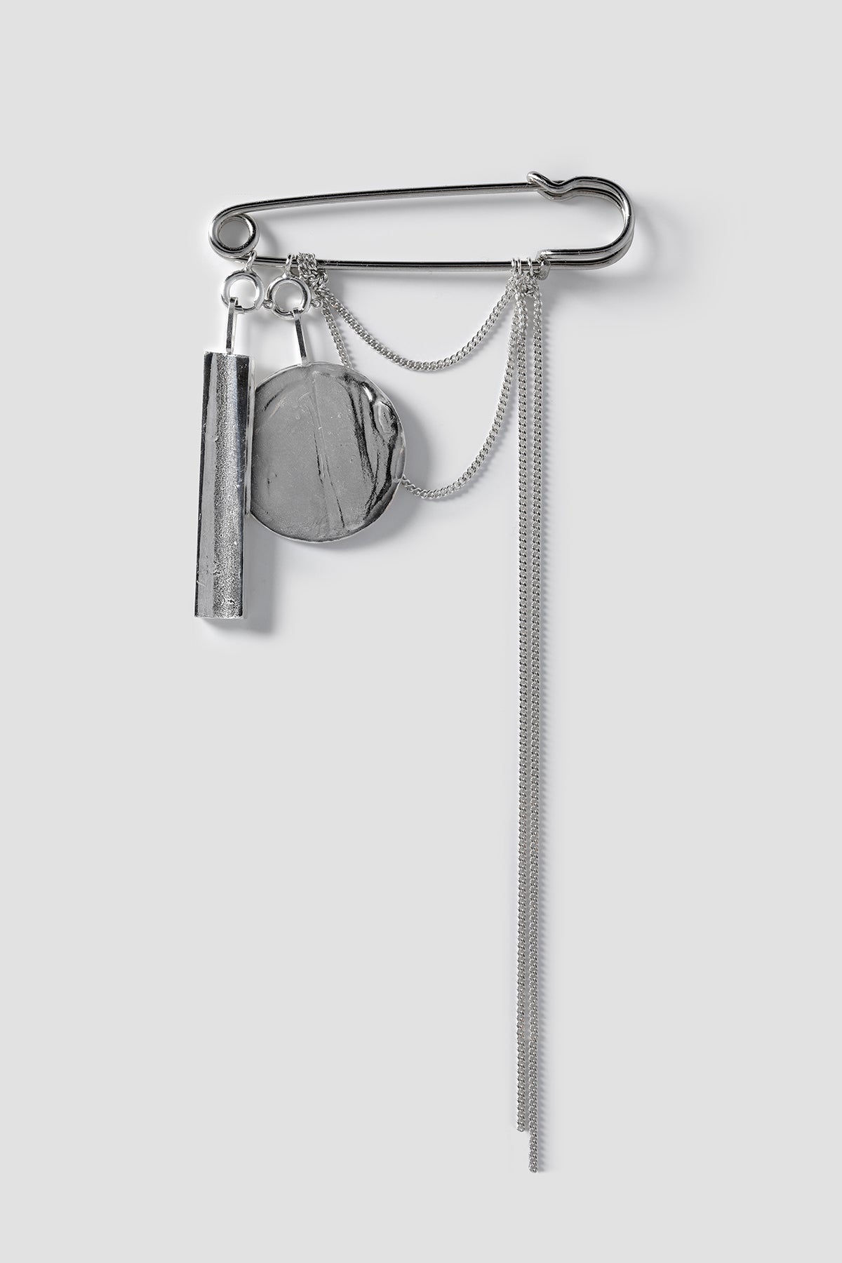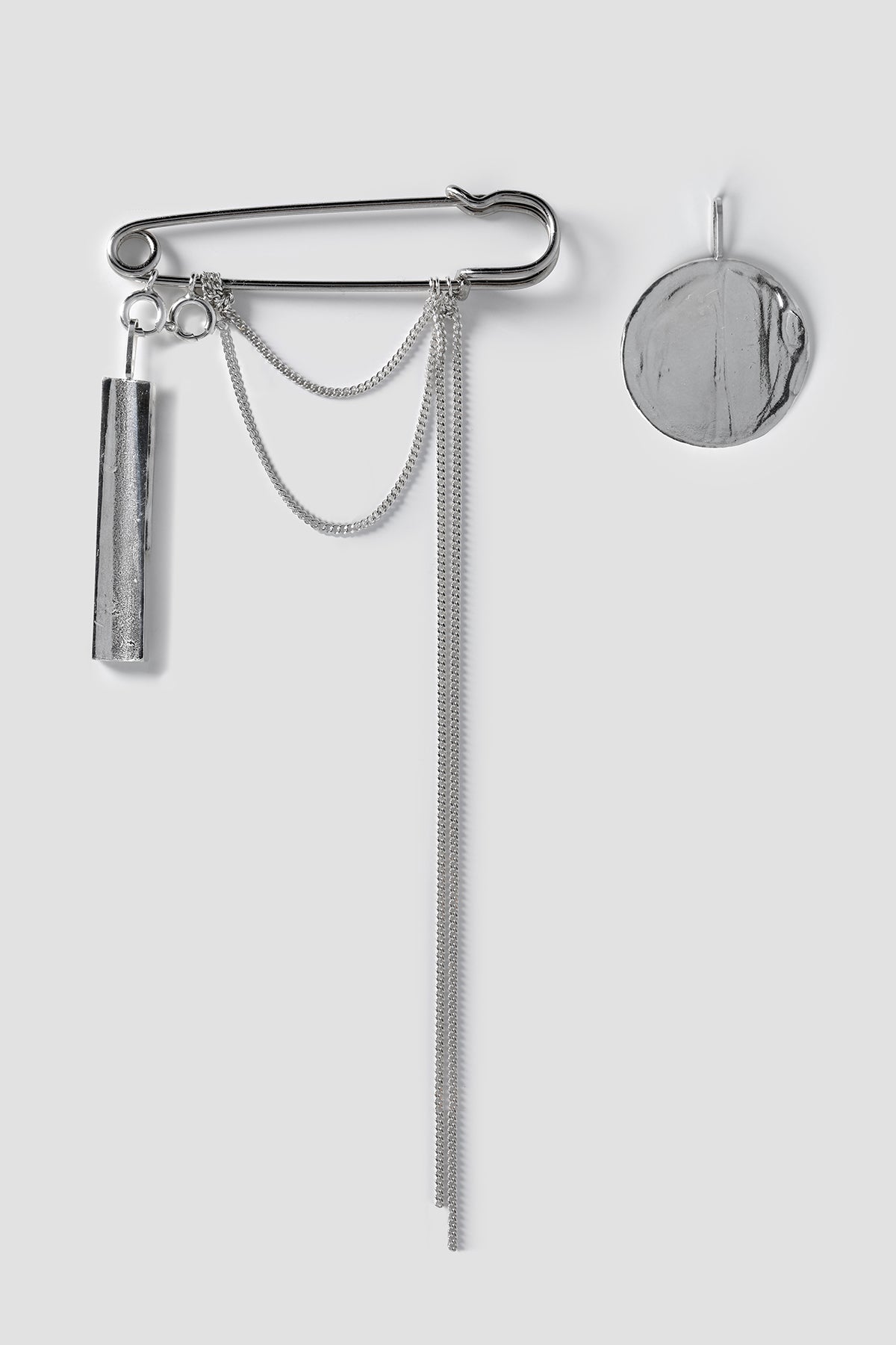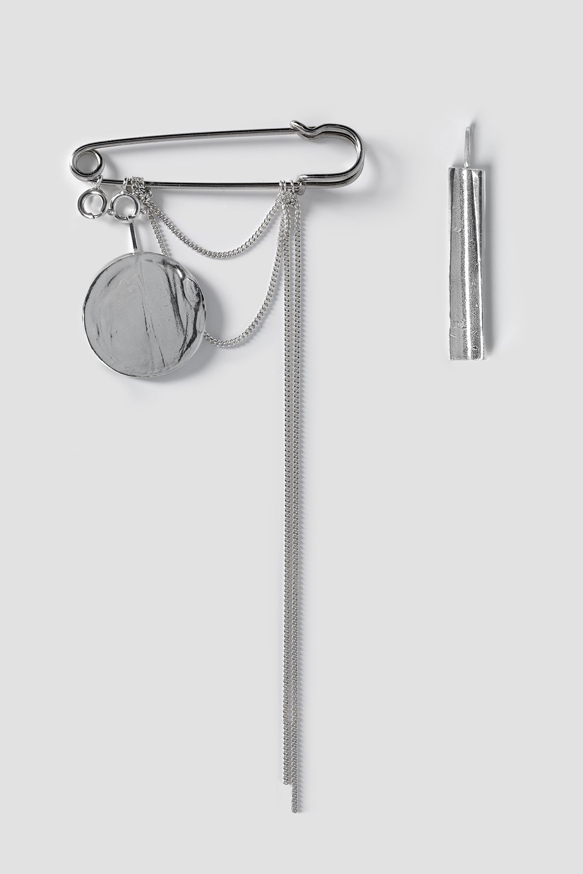As part of their collaboration, they created two silver jewellery pieces derived from the bronze mirror. A round pendant mirrors the object itself, contrasting wax-like texture with polished surface. A second, bar-shaped pendant recalls the mirror’s handle with its distinct hollow. The elements are combined in two designs: a brooch, where pendants can be worn together or separately, and a necklace, where both remain united.