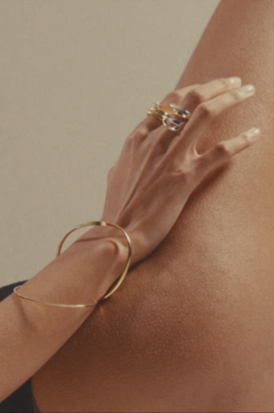Open sculptural bangle with intertwined curves forming a continuous volume. Slip on.
